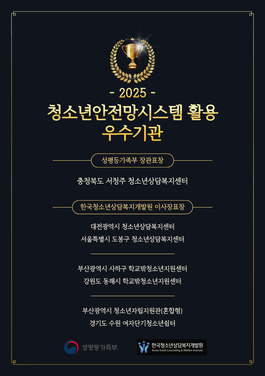 µ¿ÇؽÃÇб³¹Ûû¼Ò³âÁö¿ø¼¾ÅͰ¡ ¡®2025³â û¼Ò³â¾ÈÀü¸Á½Ã½ºÅÛ È°¿ë ¿ì¼ö±â°ü ǥâ °ø¸ð¡¯¿¡¼ Çѱ¹Ã»¼Ò³â»ó´ãº¹Áö°³¹ß¿ø ÀÌ»çÀå ǥâÀ» ¼ö»óÇß´Ù. ½Ã»ó½ÄÀº 11¿ù 20ÀÏ Á¦ÁÖµµ Èִнº ¾ÆÀÏ·£µå¿¡¼ ¿¸° 2025 Çб³¹Ûû¼Ò³â Áö¿ø»ç¾÷ ¼º°úº¸°í ´ëȸ¿¡¼ ÁøÇàµÆ´Ù.
