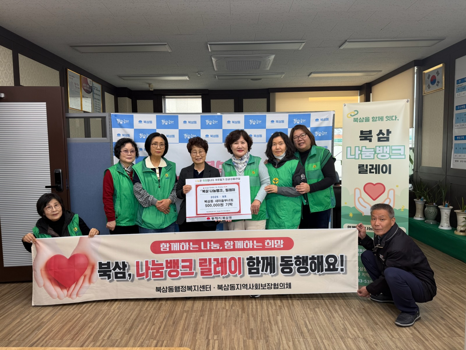 ºÏ»ïµ¿ »õ¸¶À»ºÎ³àȸ(ȸÀå ±è³²Èñ)´Â 11¿ù 24ÀÏ ¡¸ºÏ»ïµ¿,³ª´®¹ðÅ©¡¹ ¸±·¹ÀÌÀÇ ÀÏȯÀ¸·Î ¼º±Ý 50¸¸ ¿øÀ» ±âŹÇß´Ù.