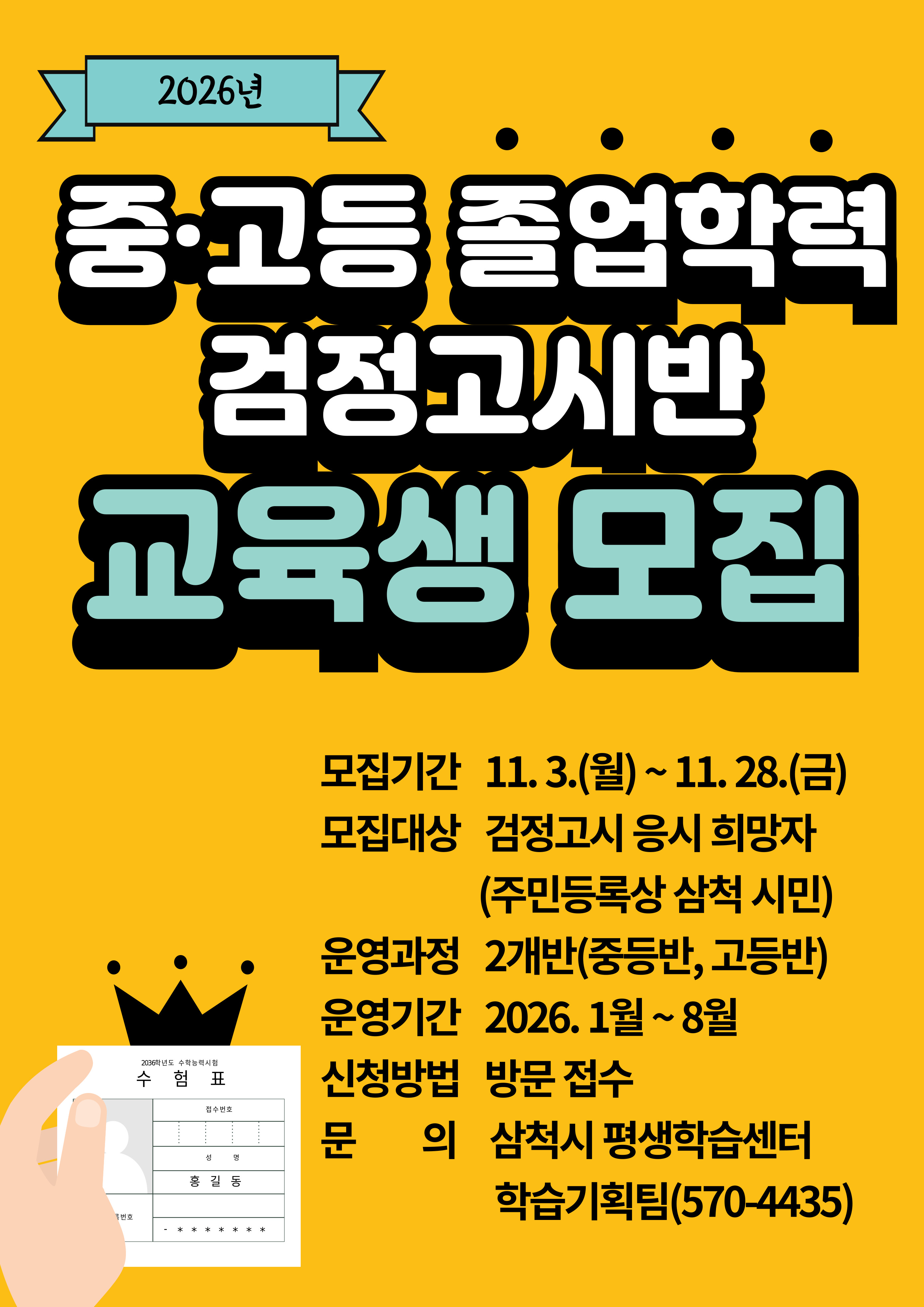 »ïô½Ã°¡ Çз ¹ÌÃëµæ ½Ã¹ÎµéÀÇ ÇнÀ ±âȸ¸¦ È®´ëÇϱâ À§ÇØ 2026³âµµ Áß¡¤°íµî Á¹¾÷Çз °ËÁ¤°í½Ã¹ÝÀ» ¿î¿µÇÑ´Ù. ½Ã´Â ³»³â 1¿ùºÎÅÍ 8¿ù±îÁö Æò»ýÇнÀ¼¾ÅÍ¿¡¼ ÁßÁ¹¹Ý°ú °íÁ¹¹Ý 2°³ °ú...