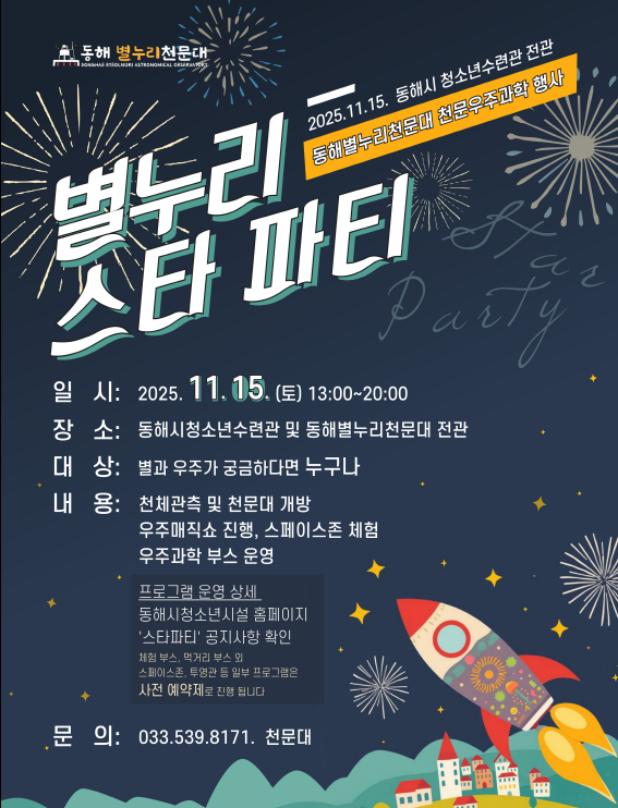 µ¿Çؽô û¼Ò³â°ú ½Ã¹ÎÀÌ º°°ú ¿ìÁÖ¿¡ ´ëÇÑ ÀÌÇØ¸¦ ³ôÀ̰í, õ¹®ÇÐÀ» ½±°í Àç¹ÌÀÖ°Ô ¹è¿ï ¼ö ÀÖµµ·Ï Çϴ üÇèÇü ÇÁ·Î±×·¥ ¡®2025 º°´©¸® ½ºÅ¸ÆÄƼ¡¯¸¦ ¿À´Â 11¿ù 15ÀÏ(Åä) µ¿Çؽú°´©¸®Ãµ...