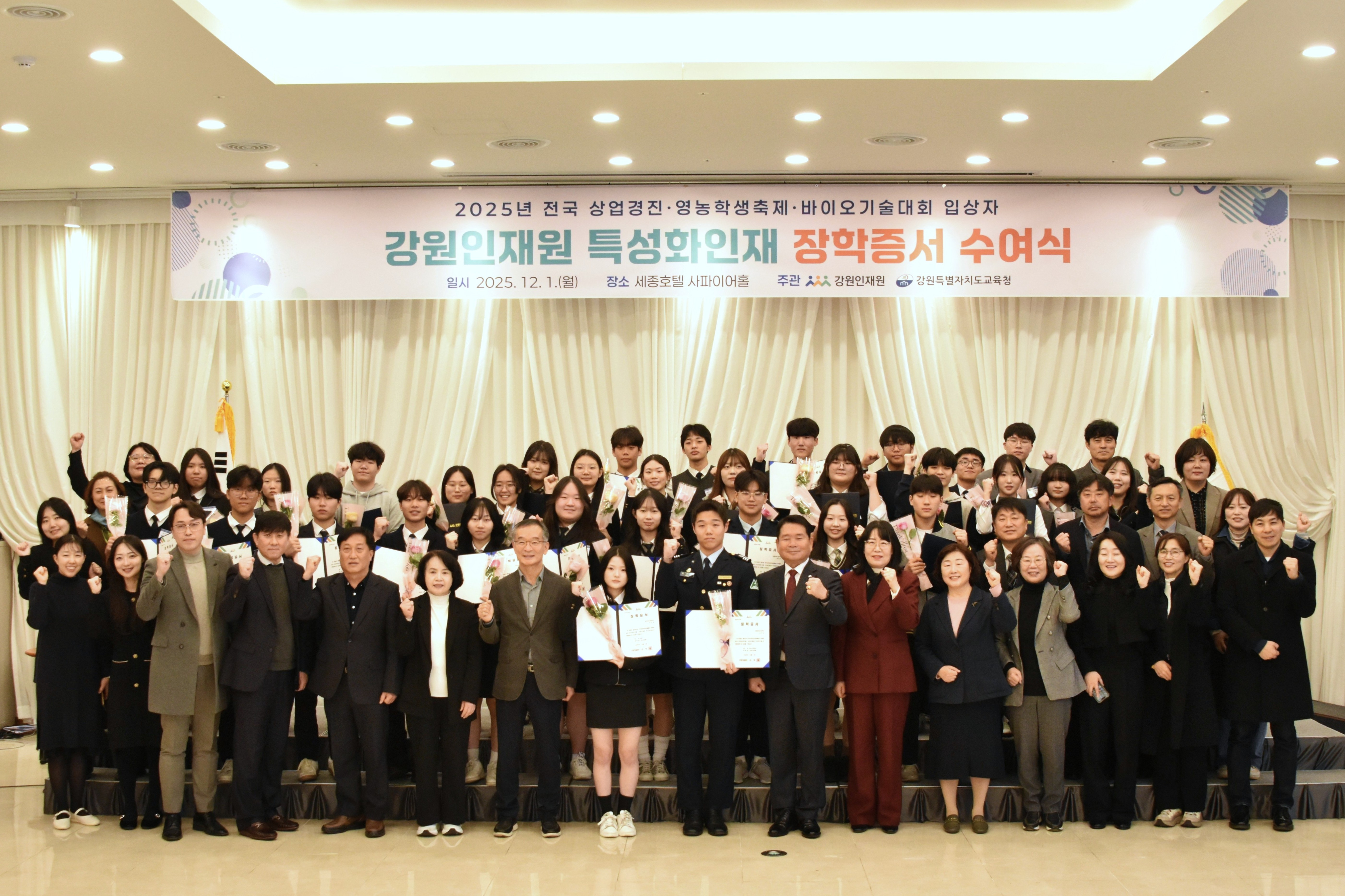 À̹ø ¼ö¿©½Ä¿¡´Â Àü±¹´ëȸ¿¡¼ ±³À°ºÎÀå°ü»óÀ» ¹ÞÀº µ¿ÇØ»ó¾÷°íµîÇб³ ±èÁø¼ ÇлýÀ» ºñ·ÔÇÑ ¼ö»óÀÚ¿Í ½Å°æÈ£ °¿øÆ¯º°ÀÚÄ¡µµ ±³À°°¨, ±èÇÐö °¿øÀÎÀç¿øÀå µî ÃÑ 100¿© ¸íÀÌ Âü¼®Çß´Ù. °¿øÀÎÀç¿øÀº Àå°ü»ó ¼ö»óÀÚ µî 70¸í¿¡°Ô ÃÑ 21¹é¸¸ ¿øÀÇ ÀåÇбÝÀ» Àü´ÞÇß´Ù. °¿øÆ¯º°ÀÚÄ¡µµ´Â ¿ÃÇØ Àü±¹´ëȸ¿¡¼ Àå°ü»ó 2°³, ±Ý»ó 9°³ µî 45°³ »óÀ» ¼ö»óÇÏ¿© ÃÖ±Ù 5³â Áß °¡Àå ¿ì¼öÇÑ ¼º°ú¸¦ °ÅµÎ¾ú´Ù.