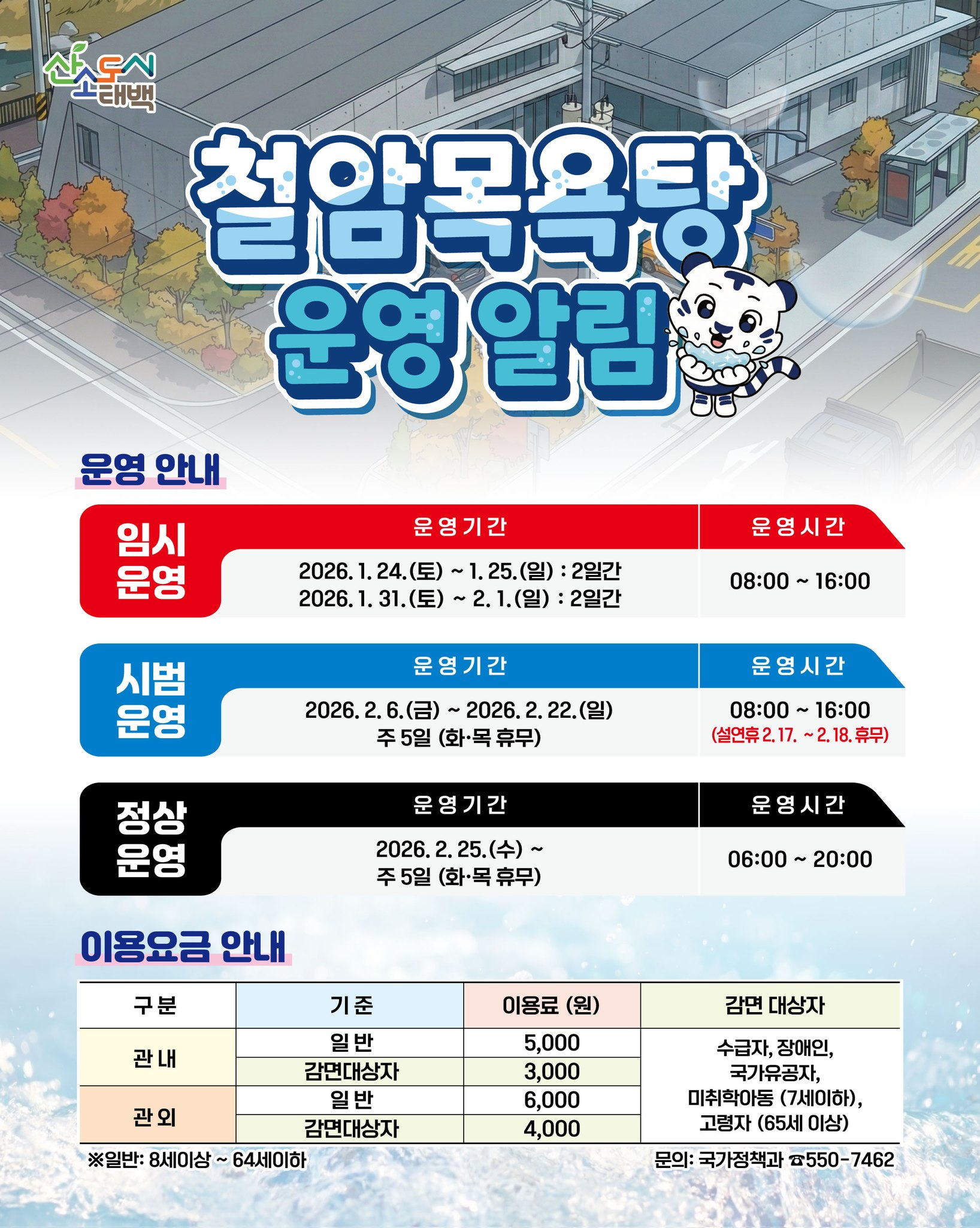 Á¤»ó¿î¿µÀº 2¿ù 25ÀϺÎÅÍ ½ÃÀ۵Ǹç, ÁÖ 5ÀÏ(È¡¤¸ñ ÈÞ¹«), ¿ÀÀü 6½ÃºÎÅÍ ¿ÀÈÄ 8½Ã±îÁö ¿î¿µÇÒ ¿¹Á¤ÀÌ´Ù.