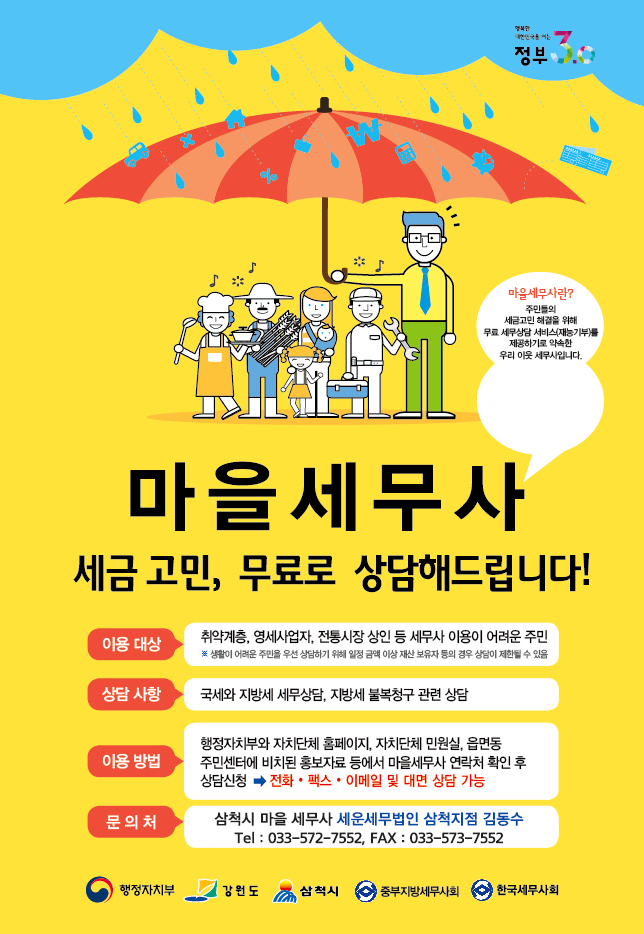 ¡®¸¶À»¼¼¹«»ç¡¯´Â ¼¼¹«»çµéÀÇ Àç´É±âºÎ¸¦ ÅëÇØ ¼¼¹«»ç ÀÌ¿ëÀÌ ¾î·Á¿î Ãë¾à°èÃþ, ¿µ¼¼»ç¾÷ÀÚ, ÀüÅë½ÃÀå »óÀÎ µîÀ» ´ë»óÀ¸·Î ¹«·á ¼¼¹« »ó´ãÀ» Á¦°øÇÏ´Â Á¦µµ´Ù. Áö¹æ¼¼¿Í ±¹¼¼ °ü·Ã ¹®Á¦, Áö¹æ¼¼ ºÒº¹Ã»±¸ Áö¿ø µî ´Ù¾çÇÑ ¼¼±Ý »ó´ãÀ» ¹ÞÀ» ¼ö ÀÖ´Ù.